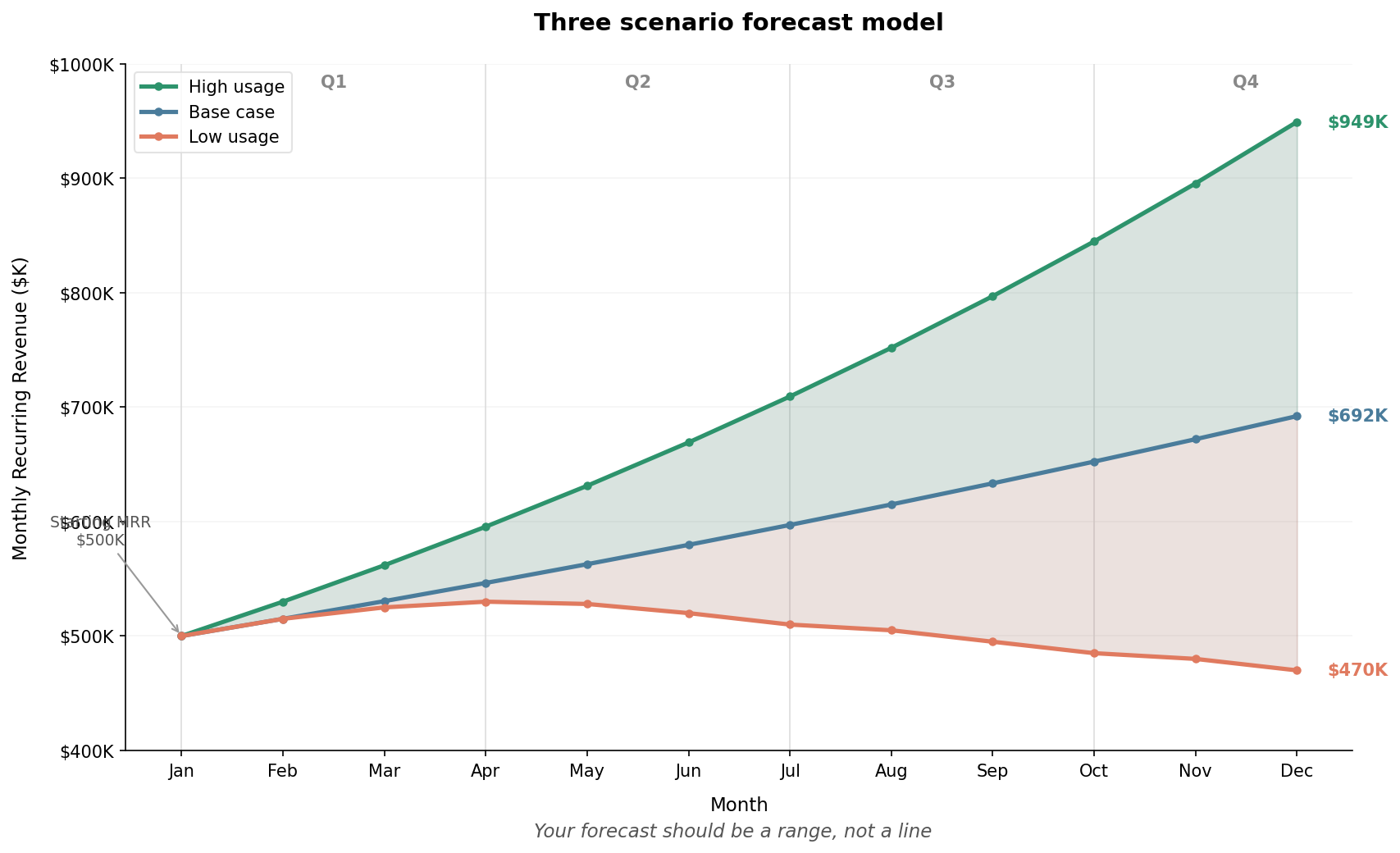 The standard approach is three scenarios: base case, high usage, and low usage. But most teams build these wrong. They take their base case and add or subtract 10% for the other scenarios. That’s wishful thinking with error bars.