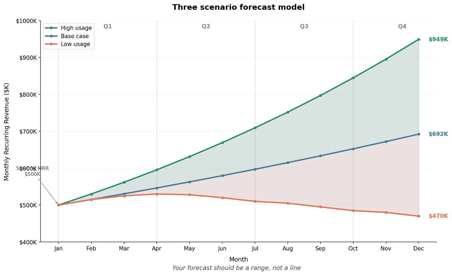 For total revenue: Combine both models. Your new logo forecast comes from pipeline. Your expansion forecast comes from usage trends. Your total forecast is the sum of both, with appropriate uncertainty ranges.