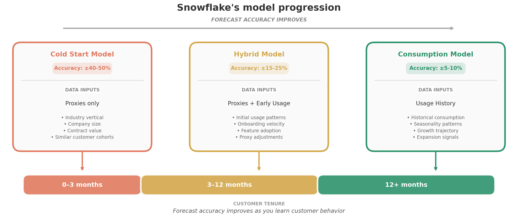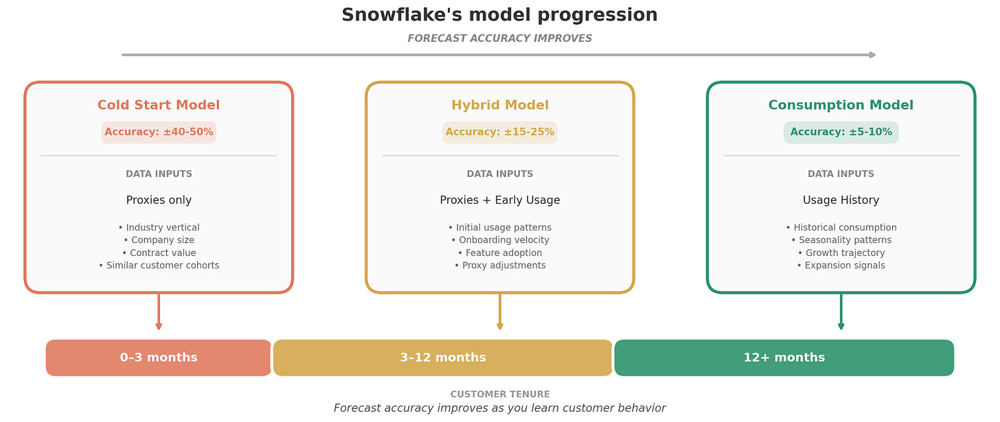 Accuracy improves with tenure. Snowflake uses different models for different customer ages. Months 0 to 3 get a “cold start” model based on proxies. Months 3 to 12 get a hybrid model that blends proxies with actual usage data. Beyond month 12, they rely primarily on the customer’s own consumption history.