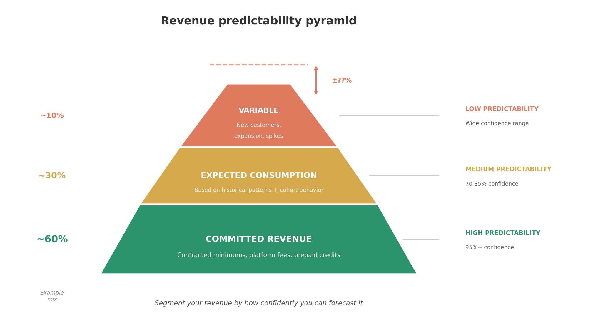 Variable consumption is usage you can’t predict reliably. New customers, customers with volatile usage patterns, and overage revenue fall here. Don’t pretend you can forecast this precisely. Build ranges instead.
