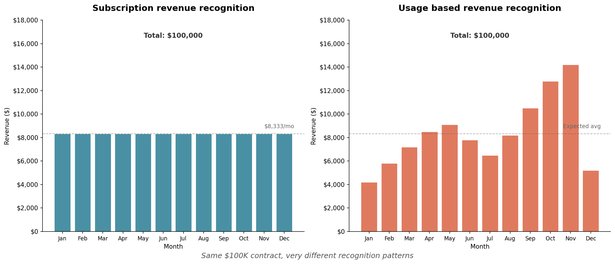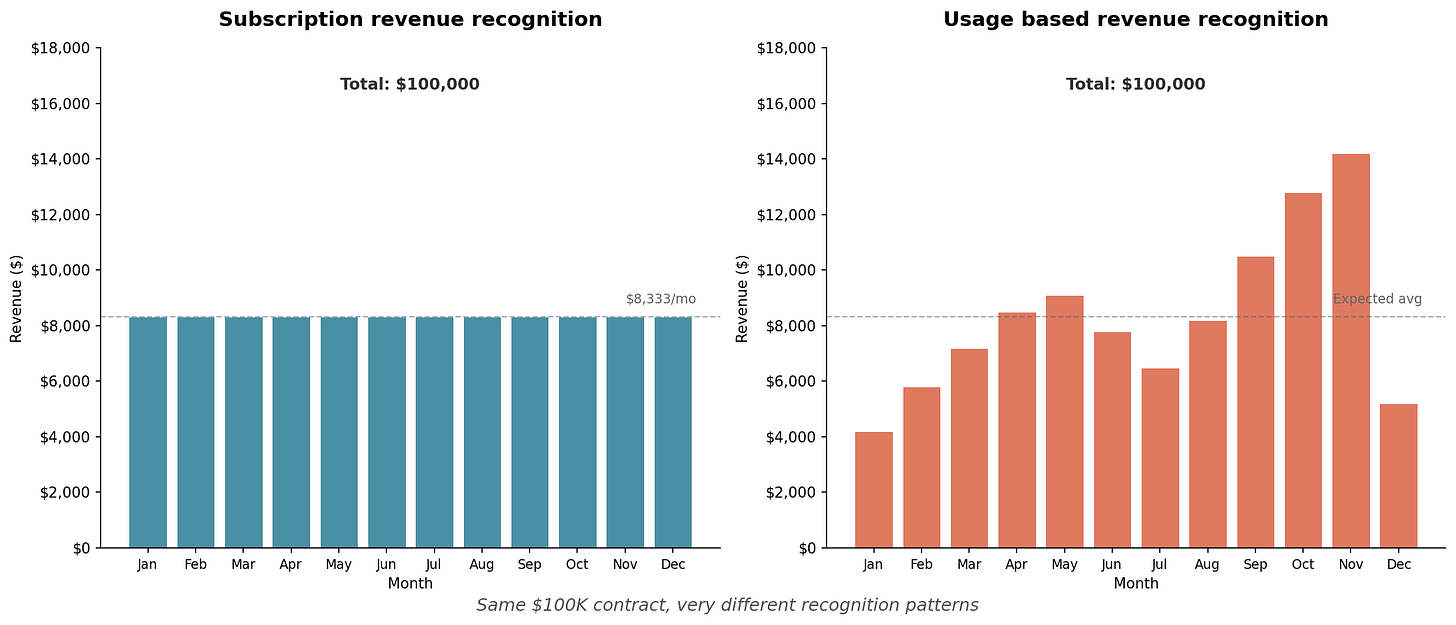 Second, the recognition schedule is no longer fixed. Revenue happens when usage happens. A customer might front-load their usage in Q1 and go quiet in Q4. Or the reverse. Or something entirely unpredictable.