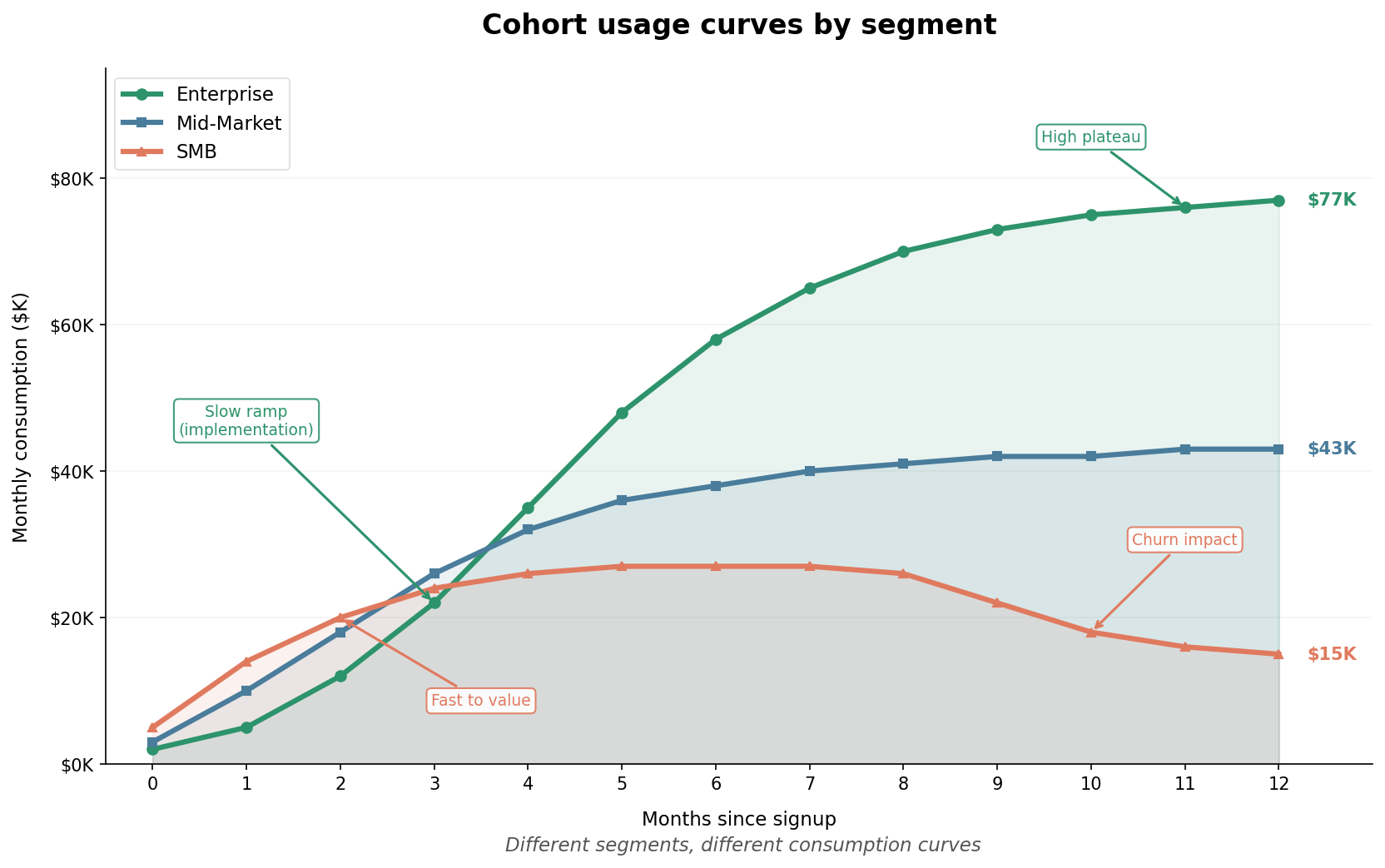 Your cohorts might look different. Enterprise customers might take longer to ramp but stabilize at higher levels. SMB customers might ramp faster but have higher churn risk. The point is to have curves you can apply to new customers based on their segment.